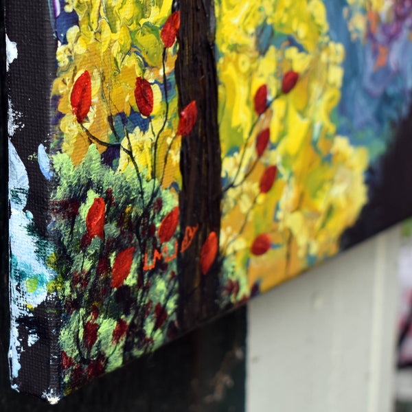 Walking back downhill on a trail in November at the McDonald-Dunn Forest in Corvallis, Oregon, I caught sight of this lovely view. Pine trees and fall colors. The mountains in the background in layers of mist. Geese flying through wispy clouds in a blue sky. This contemporary Pacific Northwest landscape is an original acrylic painting on a stretched canvas (the staple-free sides are painted). It has been varnished to protect the paint and preserve the lustrous colors.