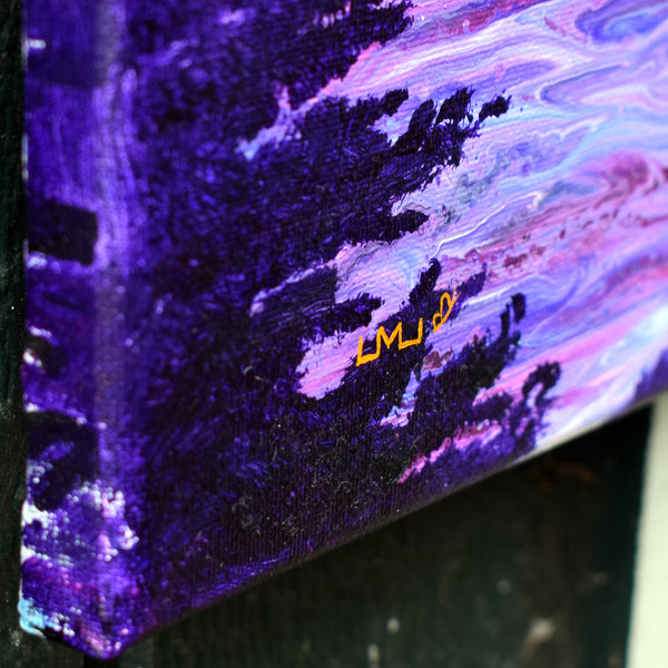 Geese fly through a purple sunset as the day comes to a close. The Vista House Museum shines on a bluff above the Columbia river gorge in Oregon. This Pacific Northwest contemporary landscape is an original acrylic painting on a stretched canvas (the staple-free sides are painted). It has been varnished to protect the paint and preserve the lustrous colors.