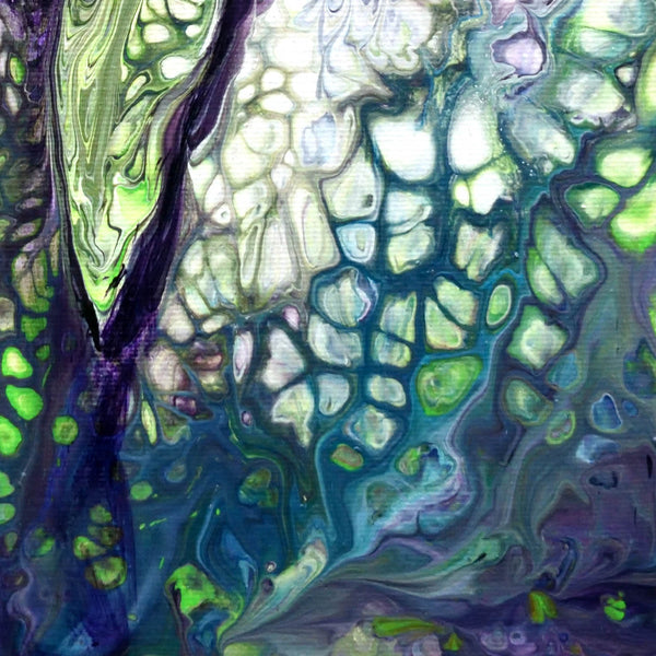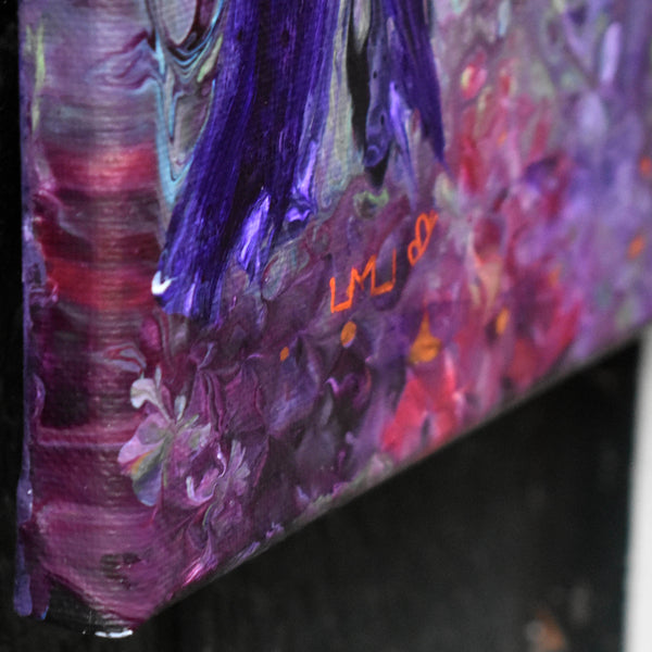 A magical morning in a forest infused with purples and greens. This contemporary fantasy landscape is an original acrylic painting on a stretched canvas (the staple-free sides are painted). It has been varnished to protect the paint and preserve the lustrous colors.