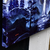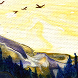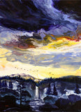 Migrating geese fly through gorgeous winter sunset clouds over pine tree covered mountains and a cascading waterfall. This lovely Pacific Northwest landscape is an original acrylic painting on a stretched canvas (the staple-free sides are painted). It has been varnished to protect the paint and preserve the lustrous colors.