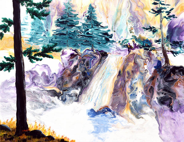 Two dragon statues stand at the entrance of a zen temple, next to a roaring waterfall. Birds fly up from the temple. A monk sits beneath a twisted pine tree regarding the temple. This shinto landscape is an original acrylic painting on a stretched canvas (the staple-free sides are painted). It has been varnished to protect the paint and preserve the lustrous colors.