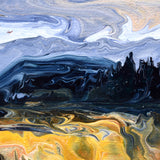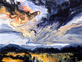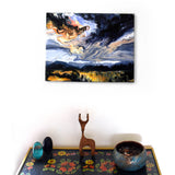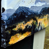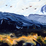 Geese fly over the wetlands at William L Finley National Wildlife Refuge. Mountains and pine trees under dramatic winter skies in shades of periwinkle and indigo, with dashes of orange light. This is an original acrylic painting on a stretched canvas (the staple-free sides are painted). It has been varnished to protect the paint and preserve the lustrous colors.