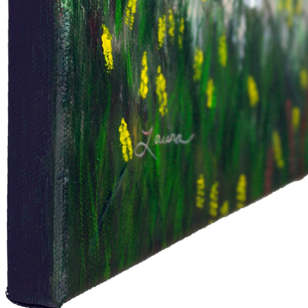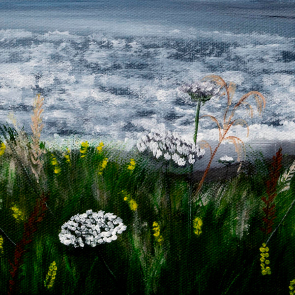 Queen Anne's Lace and California wildflowers on a bluff overlooking the Pacifica coastline. Seagulls glide through the dramatic stormy gray rain clouds. This seascape, from Pacifica, California, is an original acrylic painting is an original acrylic painting on a gallery-wrapped stretched canvas (the 3/4″ sides are finished off in dark green). It has been varnished to protect the paint and preserve the lustrous colors.